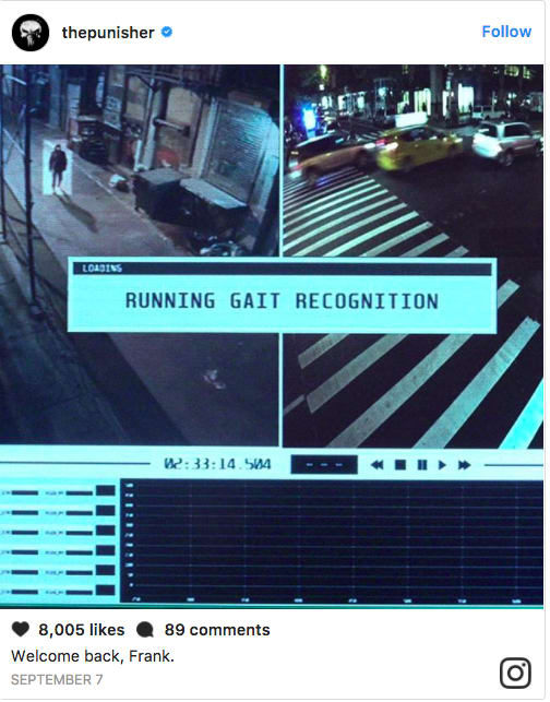 The second teaser showed more CCTV footage, but was accompanied by a very different comment: "Welcome back, Frank." For those who are unaware, Gait Recognition is an emerging biometric technique used to identify people by their walking patterns. It's cutting-edge technology, currently being pioneered for home security, and undoubtedly of interest to espionage agencies. The Punisher is clearly being hunted down, and his pursuers have some pretty remarkable tech.